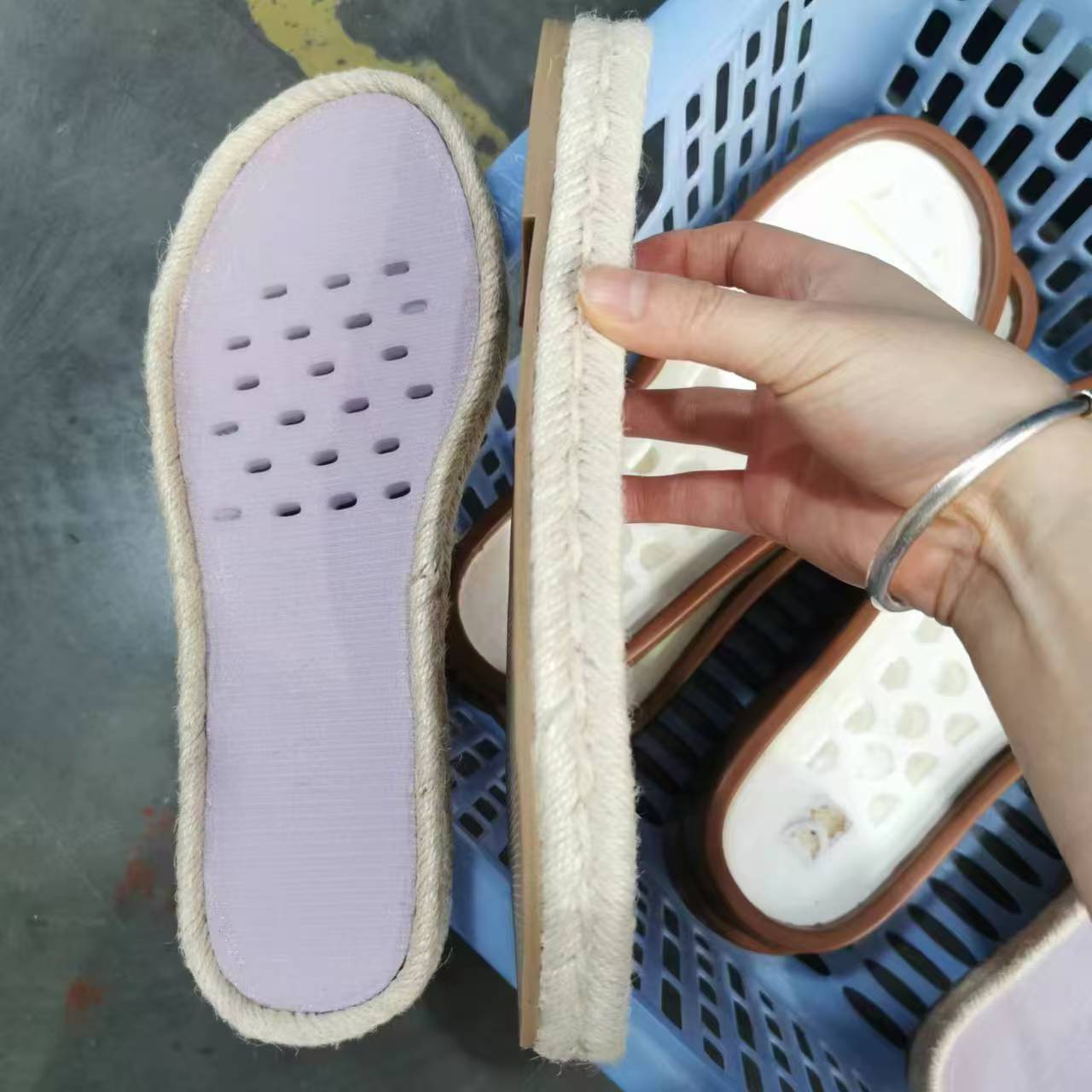 The woven and spliced process: involves first processing hemp fibers into standardized hemp ropes, then weaving them into sheet-like hemp rope fabric using machines. This fabric is then cut to the appropriate size for the sole and spliced with materials such as rubber midsoles and EVA soles through gluing or sewing to create a composite hemp rope sole. This process allows for flexible adjustment of the hemp rope weaving density; higher density results in greater abrasion resistance. It also allows for the combination of different midsole materials, balancing breathability and anti-slip performance. Commonly found in summer sandals and espadrilles, this process retains the natural texture of hemp rope while improving the durability and comfort of the sole. In addition, there are hemp rope insoles made by braiding hemp rope into a twisted shape, then coiling it according to the size of the midsole, and finally gluing it to the midsole. These are primarily designed for moisture absorption and breathability, suitable for sandals and other footwear.
