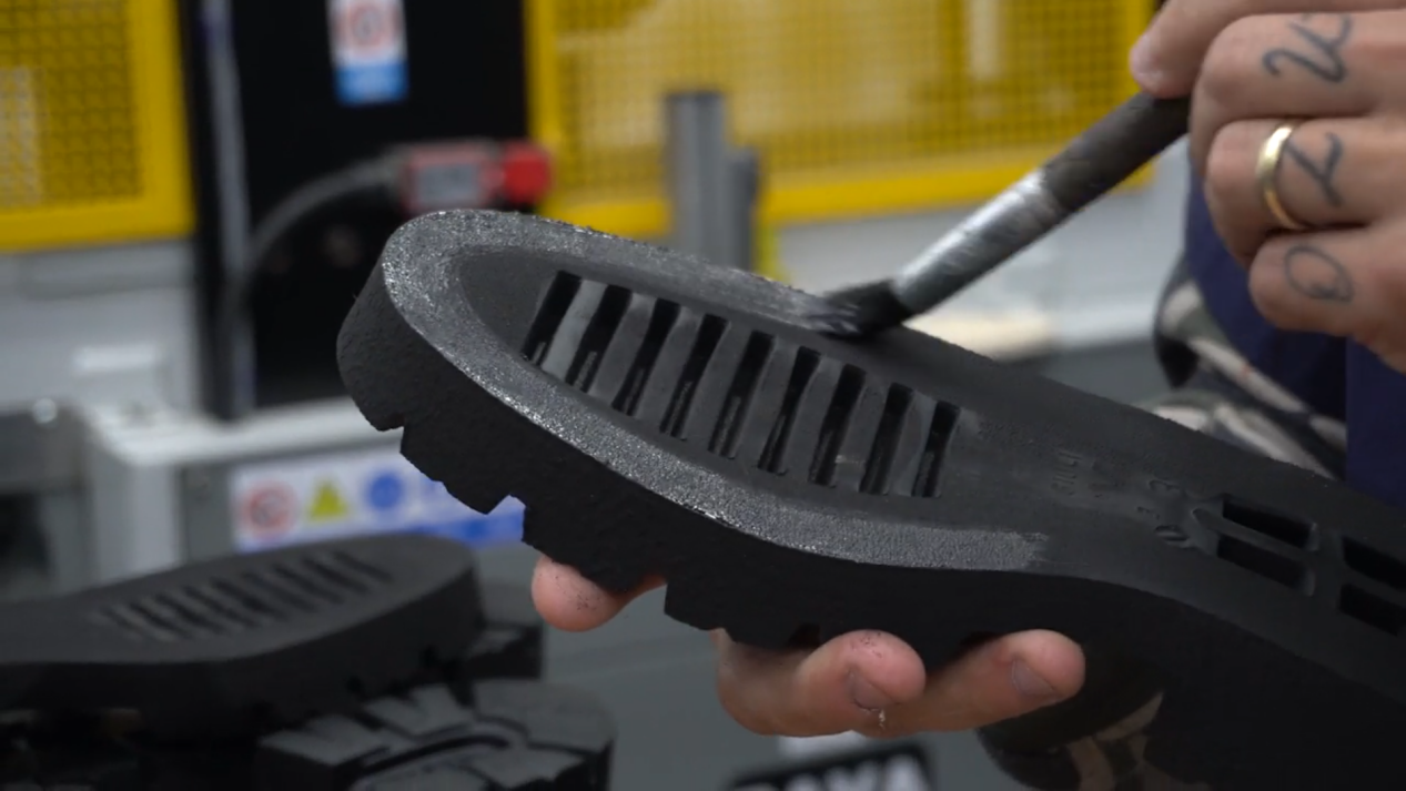 5. Place the sole and heat: Place the sole in the lower mold, close the upper mold, and enter the heating process to bond the sole and the welt together.