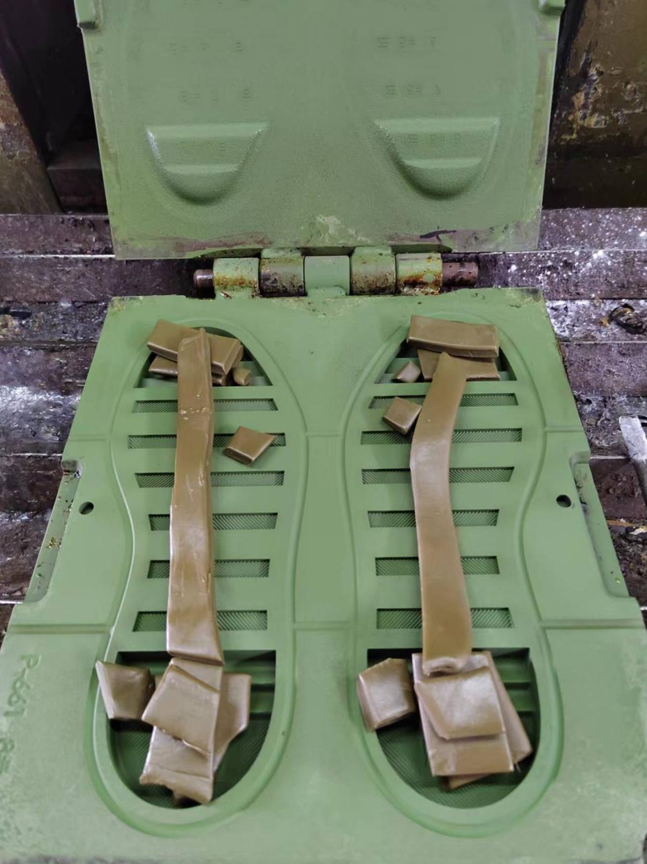 1.Mold Preparation & Rubber Vulcanization: Raw rubber material is placed into the designated mold cavity. The mold is then closed, and the rubber is cured under heat and pressure through a process called vulcanization, forming the durable outsole.