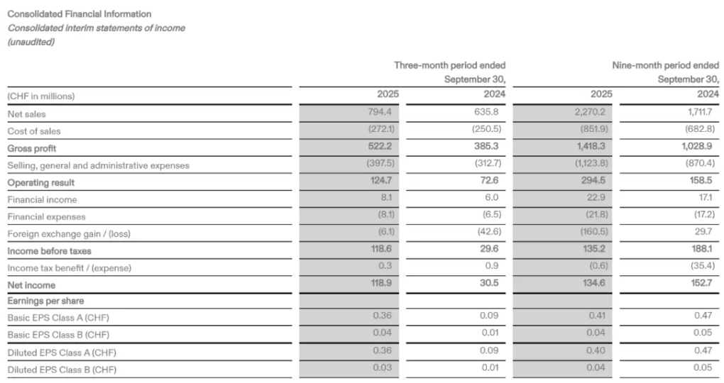 1. On Running: In Q3 2025, its revenue reached 7.94 billion Swiss francs, and net profit increased by 290%. All regions and product categories showed growth.