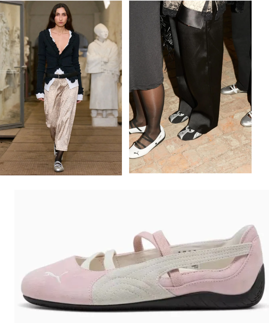 Racing shoes' narrow build (for cramped cockpits) translates to runway-ready slimness. Jennie's Adiracers in Extral MV paired seamlessly with tailored suits, while Puma's Speedcat Ballerina remix merges ballet elegance with racing grit.