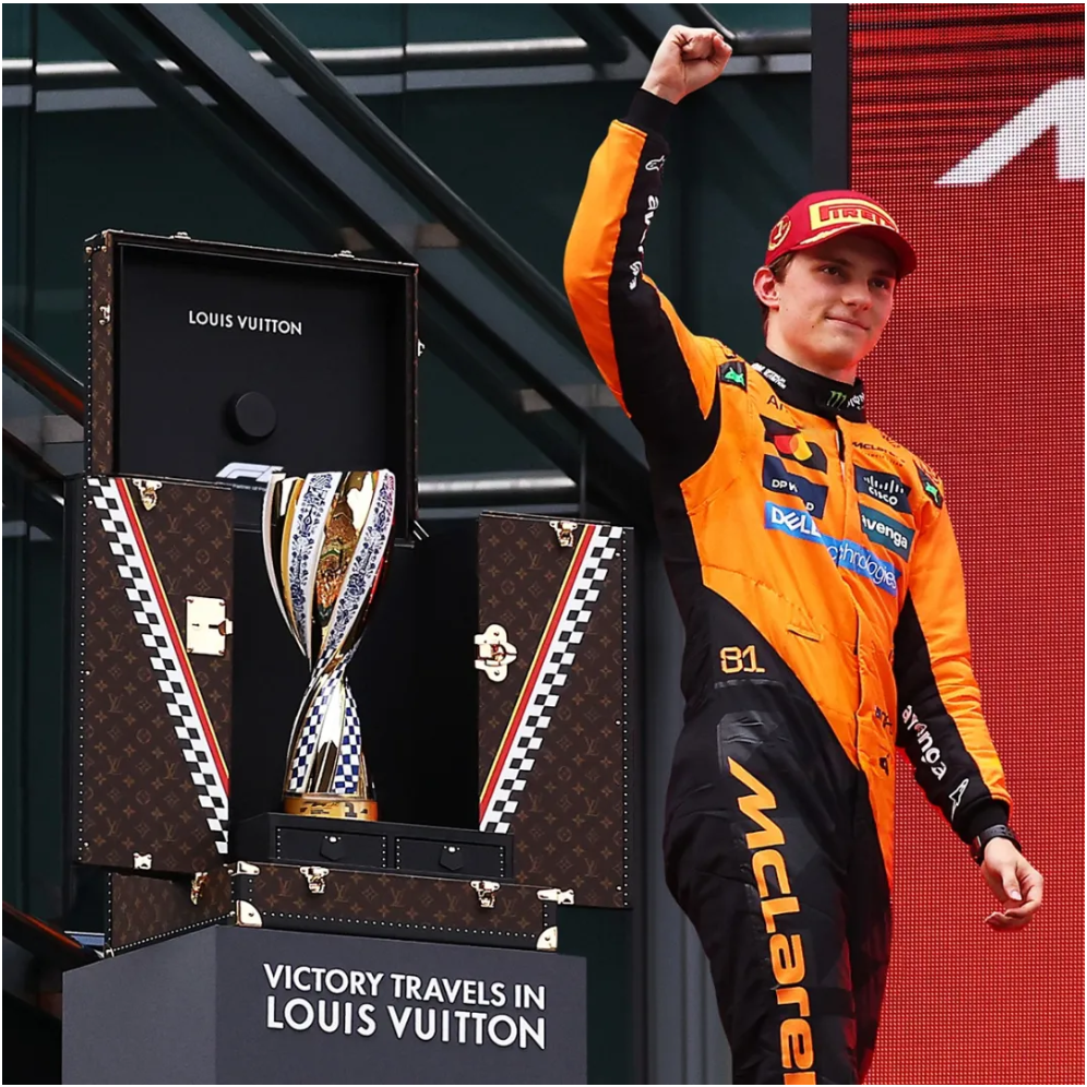 A key reason Luxury giant LVMH replaced Rolex as F1's title sponsor this year. Every lap now flashes LV's blurred-logo visuals, and trophies (like McLaren's Shanghai win with blue-and-white porcelain motifs) are LV-crafted.
